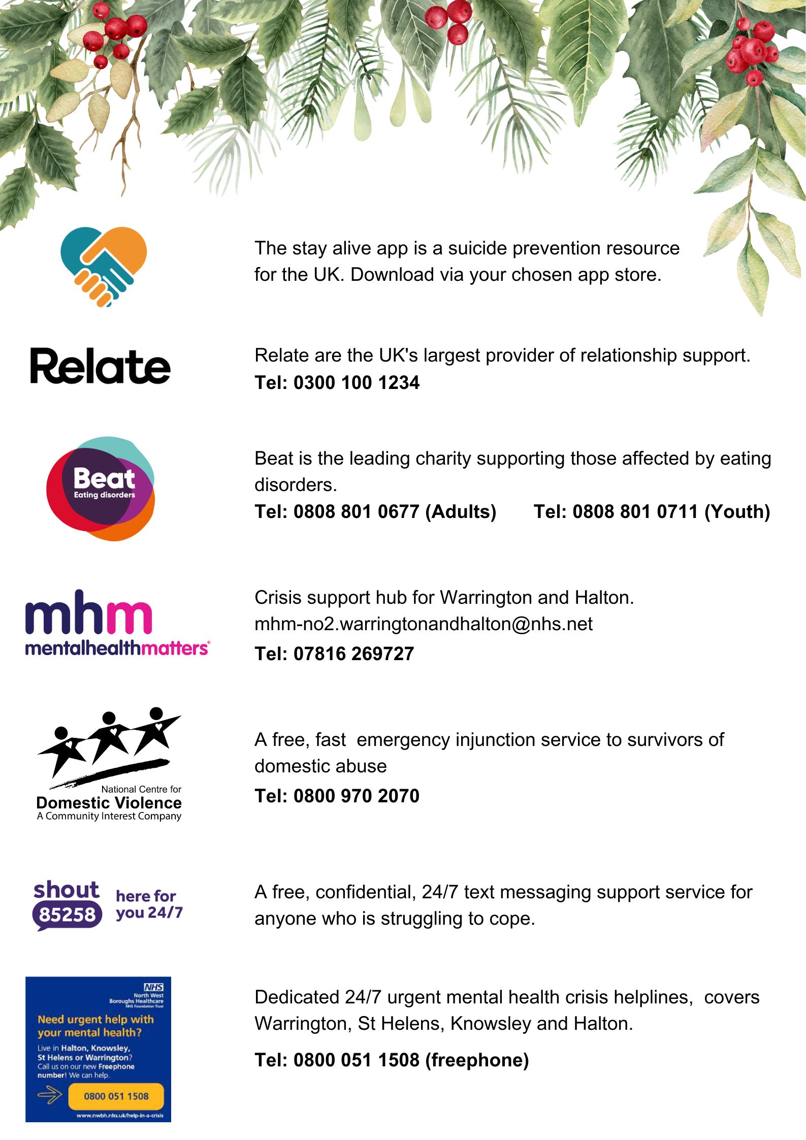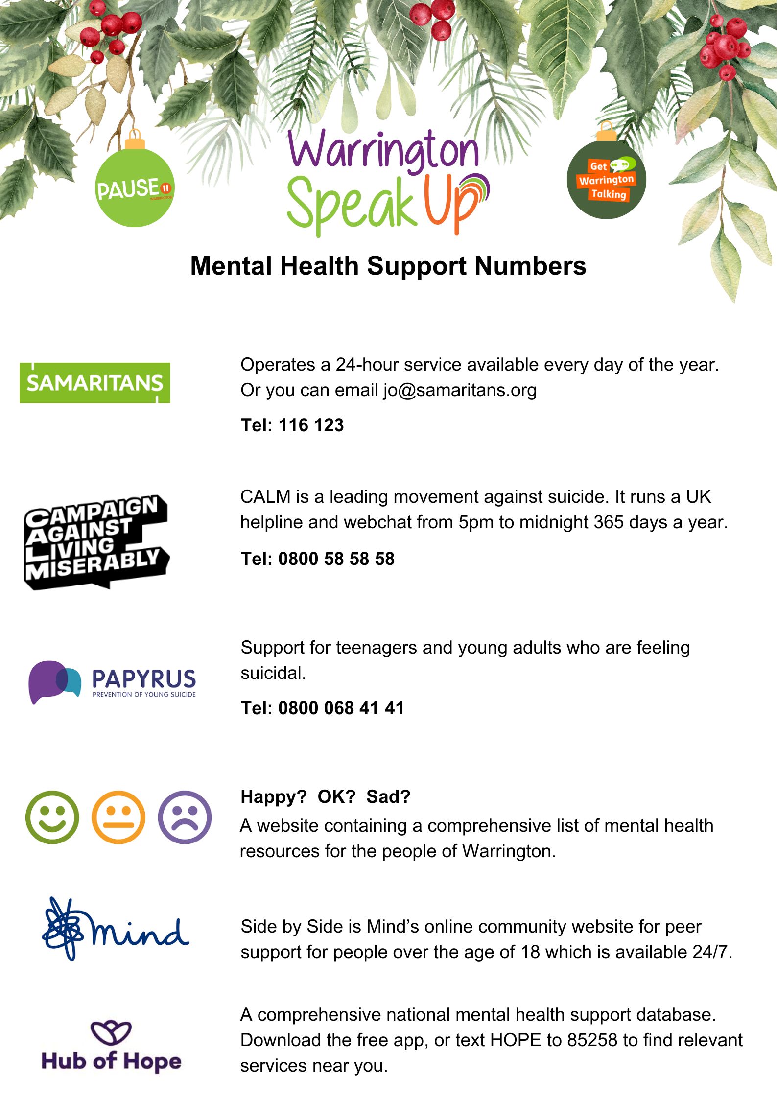 We know Christmas can be a tough time for some. If you’re struggling or just need someone to talk to, there are amazing organisations ready to listen and help. You’re not alone, and support is always available. Please take a look below.