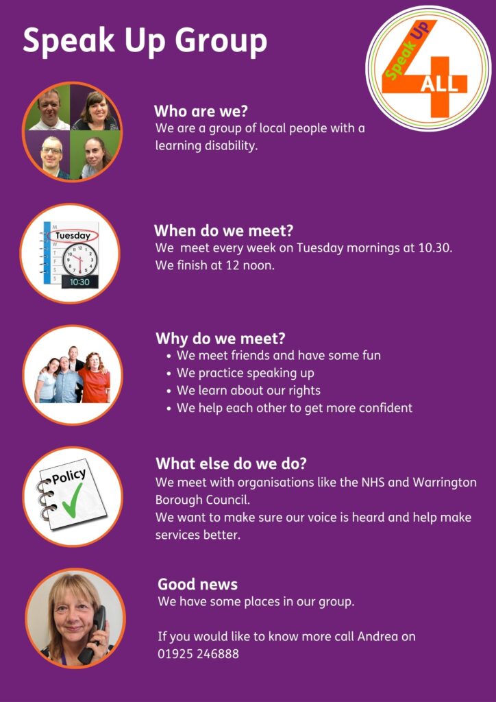 Local self-advocates with a learning disability and/or autism meet weekly to practice speaking up, develop their confidence, meet friends and have some fun. Warrington Borough Council, ICB and NHS regularly consult with the group on strategic issues and policy decisions and are respected for both their contribution and ability to challenge.