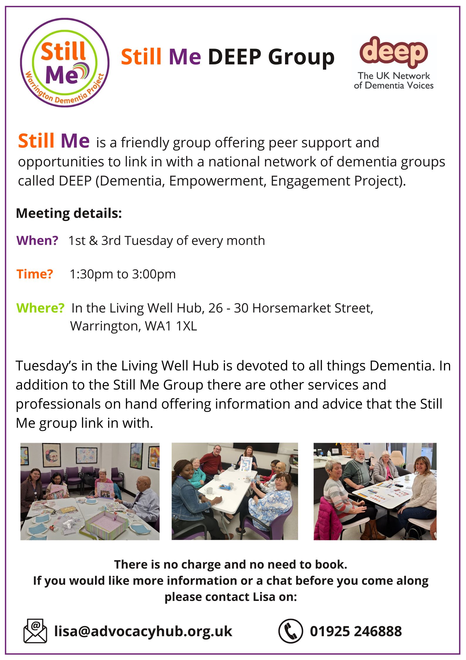 The Still Me Warrington DEEP group (Dementia Engagement and Empowerment Project – the UK network of dementia voices) is a peer support group for people living with dementia and their carers. Please see the poster below.