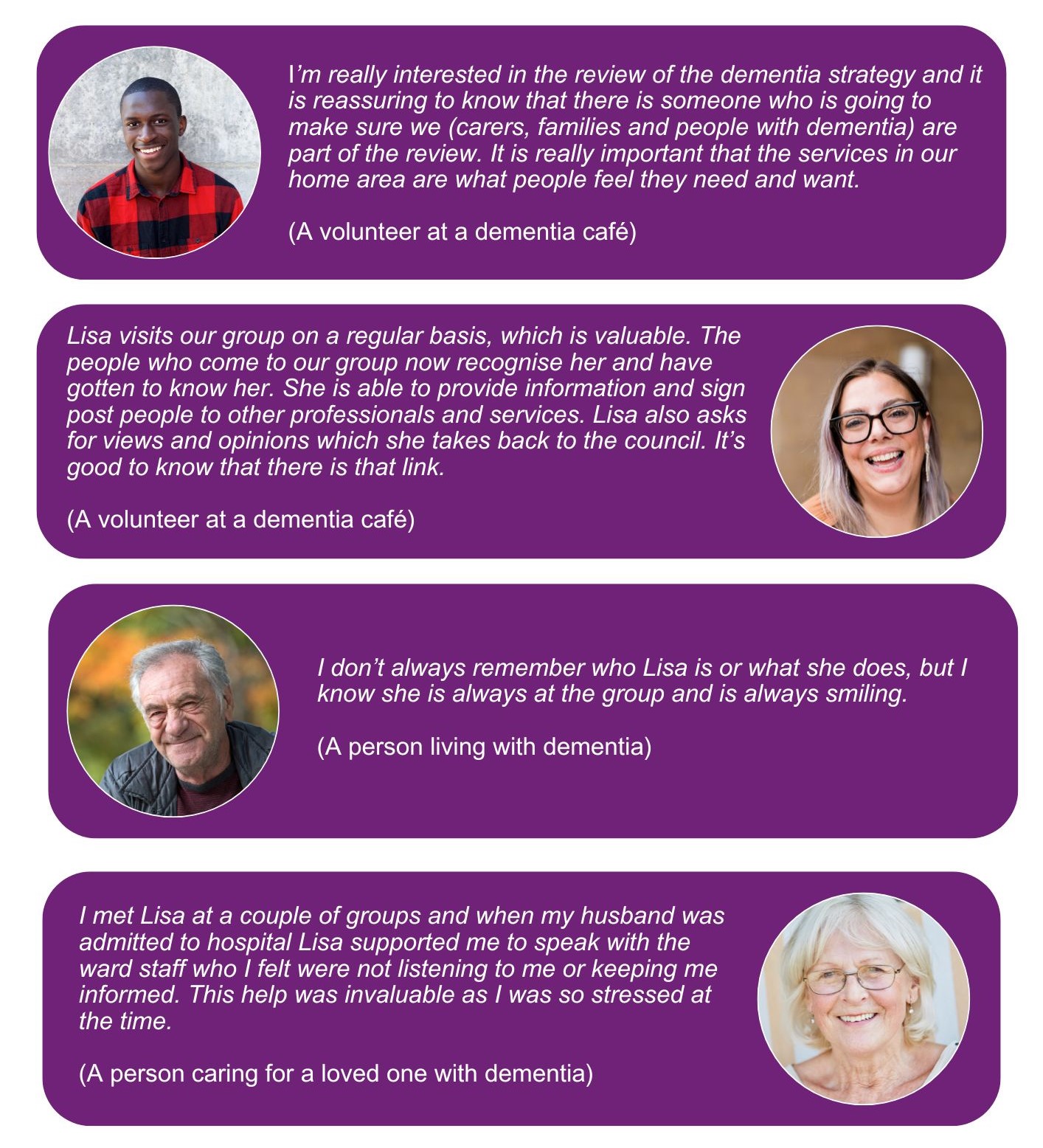 Working in partnership with people living with dementia, carers, community groups and organisations we aim to collate views, themes and experiences. We recognise people living with dementia want others to know that they still want lives that are meaningful and full. They want to end the stigma attached to the word ‘dementia’.